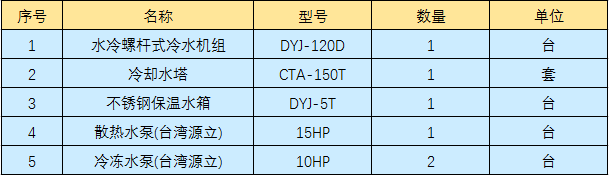 清遠(yuǎn)皮革廠壓花機(jī)橡膠輥冷卻,通過工廠技術(shù)人員核算,需要配120HP水冷螺桿式冰水機(jī)組2臺(tái),客戶直接百度水冷螺桿式冰水機(jī)找到東躍進(jìn)制冷,通過幾天的電話及文字溝通確認(rèn),最終訂購(gòu)2臺(tái)120HP水冷螺桿式冷水機(jī)組以及輔助設(shè)備,型號(hào)及數(shù)量如下表:
